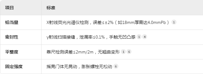 铅玻璃:厚度按防护需求选择(如CT机房主防护≥2.5mmPb,对应厚度约18mm),密度≥4.2g/cm³,透光率≥85%,无气泡、划痕。